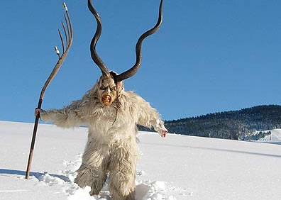The festival’s roots stretch back into pre-Christian times when Germanic mountain folk paid homage to Krampus the child-stealing demon of winter darkness. Krampus was a hell-sent god with goat’s horns, coarse black fur, and a fanged maw. He would visit disobedient or inattentive children and beat them with a cruel flail before tearing them to bits with his claws (in fact “Krampus” means “claw” in old high German).